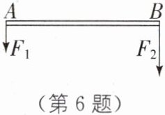 6 如图所示,在一根轻质杠杆AB两端分别施加竖直向下的力$F_1、$$F_2(F_1<F_2),$此时杠杆在水平位置平衡。若使$F_1、$$F_2$同时增大10 N,则杠杆( )。