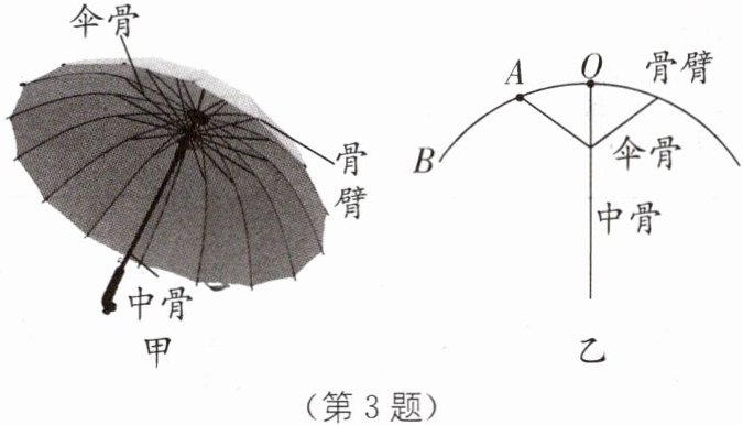 3 中考新考法 雨伞模型构建 如图甲所示是我们生活中常见的直杆雨伞,图乙为雨伞打开状态下的简化图,骨臂OB可绕O点上下转动,骨臂受到沿伞骨向上的动力F,请你在图乙中A点画出动力F及动力臂l。