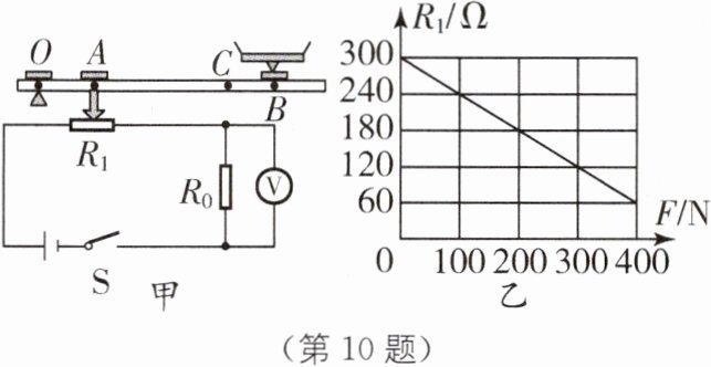 10 (2024·泰州海陵区一模)在课外实践制作活动中,小红将量程为 0~3 V 的电压表改装成一个测量质量的电子秤,电路如图甲所示.电源电压恒为 6 V,电阻 R₀为 60 Ω,压敏电阻$ R_1$的阻值随压力变化如图乙所示.O 点是杠杆 OAB 的支点,托盘固定在 B 点,AO∶BO= 1∶4,托盘及杠杆组件的质量忽略不计,g 取 10 N/kg.