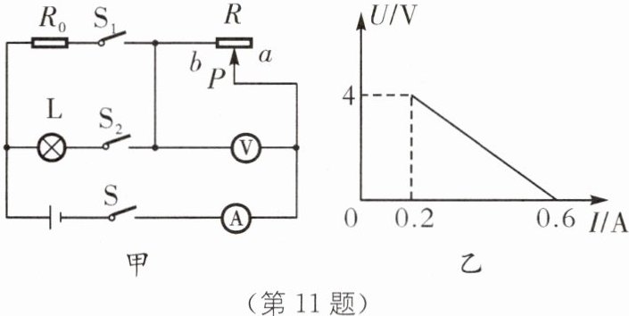 11 在如图甲所示的电路中,R₀为定值电阻,R 为滑动变阻器,电源电压保持不变.只闭合开关 S 和$ S_1,$将滑动变阻器的滑片 P 从 a 端移动至 b 端的过程中,电流表示数 I 与电压表示数 U 的变化关系如图乙所示.闭合开关 S、$S_1$和$ S_2,$将滑动变阻器的滑片 P 移到 b 端时小灯泡正常发光,此时电流表的示数为 0.8 A.求: