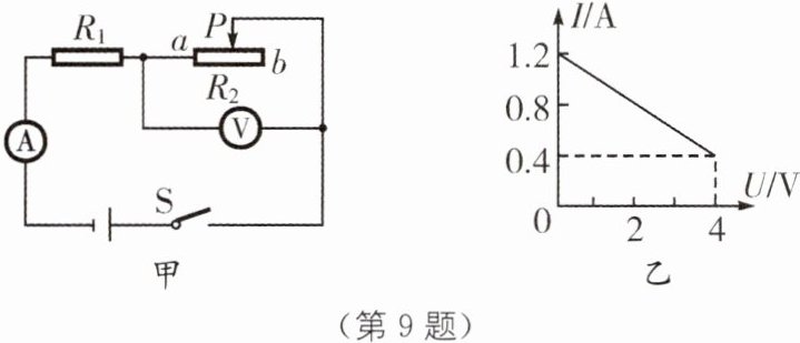 9 如图甲所示的电路中$,R_1$为定值电阻$,R_2$为滑动变阻器,电源电压不变.闭合开关 S 后,滑片 P 从 a 端移动到 b 端,电流表示数 I 与电压表示数 U 的变化关系如图乙所示,则电源电压为$______V,R_1$的阻值为______Ω.