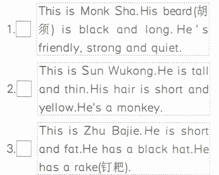 3.T 解析:由短文中“This is Zhu Bajie.He is short and fat.”可知,猪八戒是又矮又胖的,与本句描述相符,故答案为T。