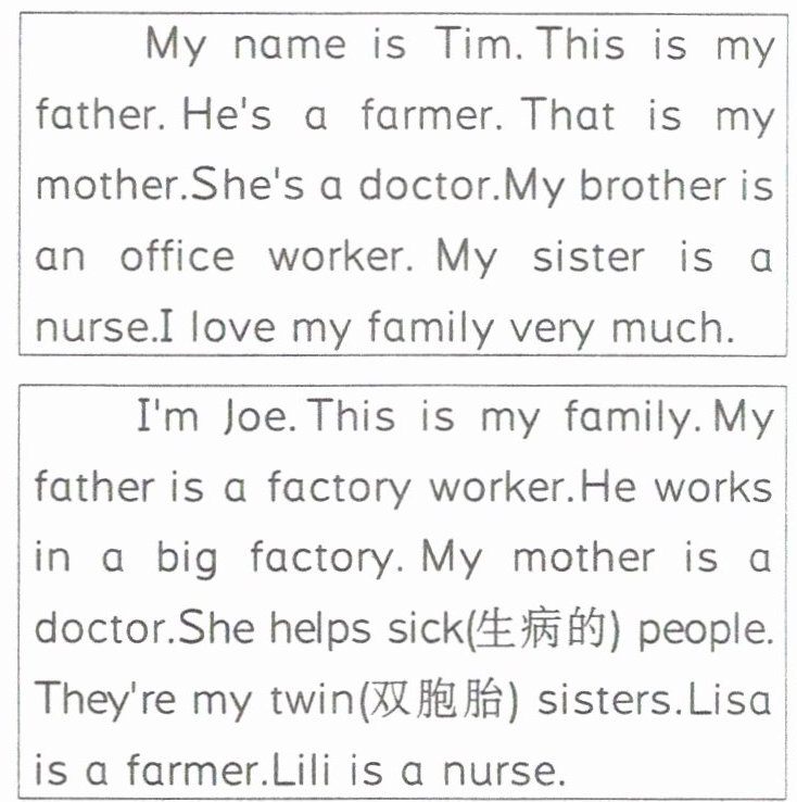 (生活情境)三、下面分别是Tim和Joe的家庭情况介绍。阅读介绍,完成下列各题。