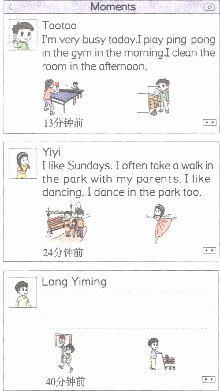 )3. Yiyi often takes a walk in the park on Sundays.(二)Long Yiming 忘记给自己的朋友圈编辑文字了。根据他发的照片,仿照其他小朋友的文字信息,帮 Long Yiming 编辑一段文字吧。(写在图中空白处)