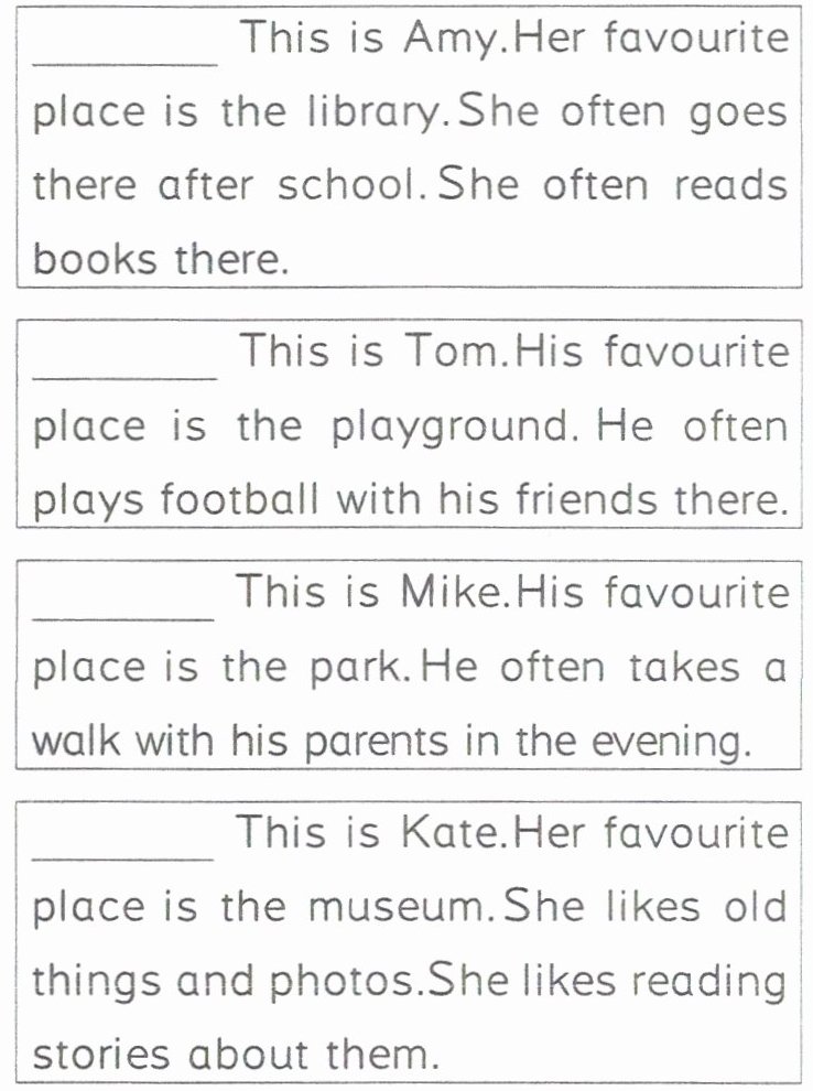 解析:由短文中“Her favourite place is the library.” “His favourite place is the playground.”“His favourite place is the park.”“Her favourite place is the museum.”