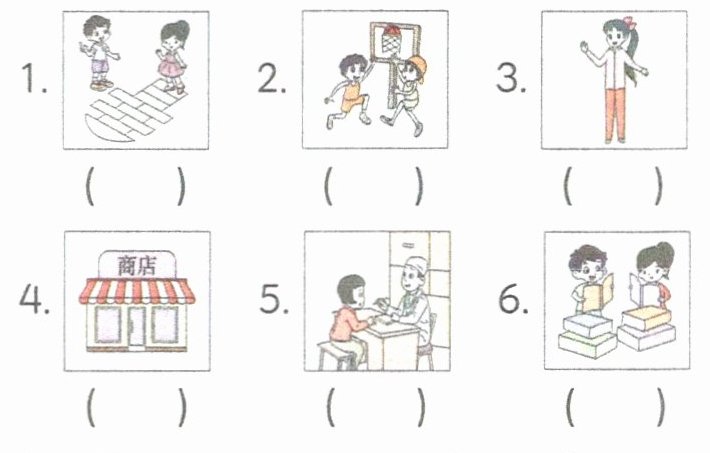 二、Youyou 和 Yueyue 在更新宣传栏里的照片,给照片选择对应的句子或对话。