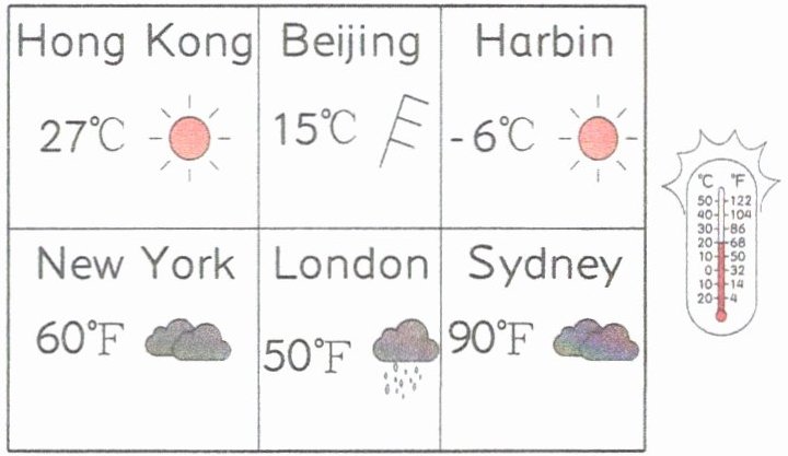 二、Chenchen 从网上浏览了几个城市的天气情况并整理成了表格,根据表格内容,判断句子正(T)误(F)。