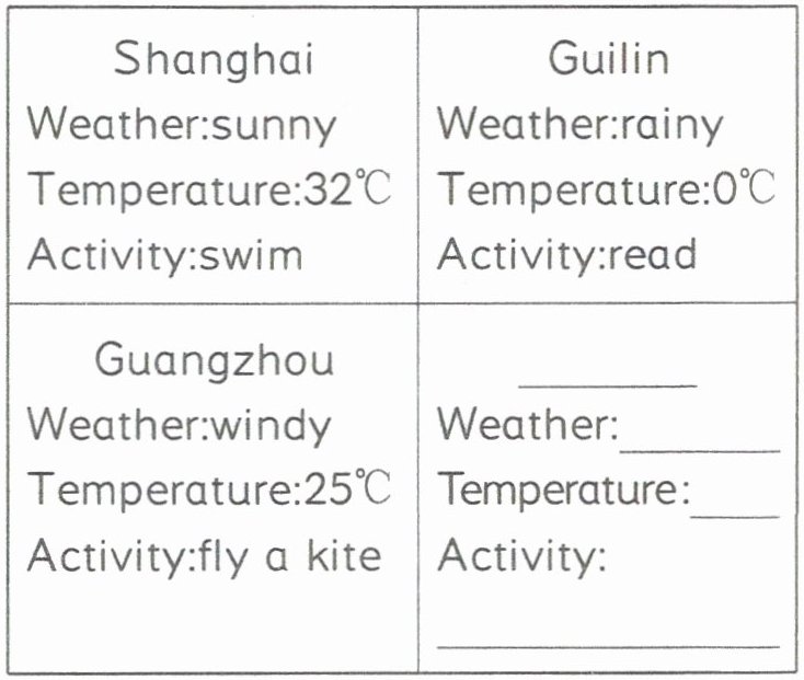 (二)请你用你的城市的天气,温度以及做的事情补全表格的空缺处,并用句子表述出来。
