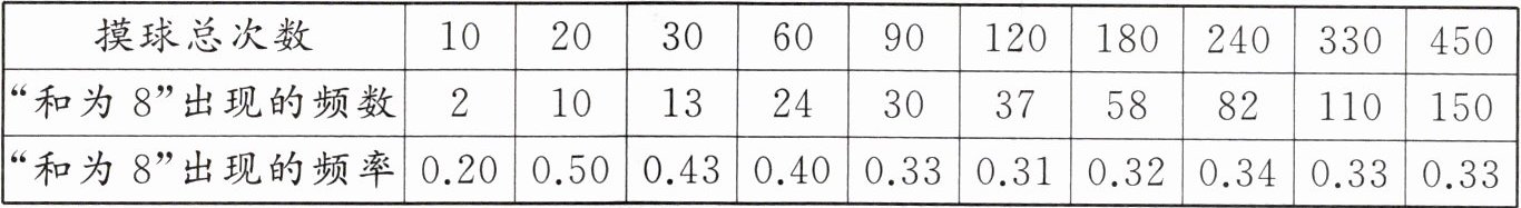 (1)如果试验继续进行下去,根据上表数据,出现“和为 8”的频率将稳定在它的概率附近,估计出现“和为 8”的概率是