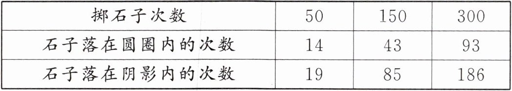 8.解:由已知得:当分别投掷50次,150次,300次时,石子落在⊙O内(含⊙O上)的次数m与石子落在阴影内的次数n的比值分别是:$\frac{14}{19}$≈0.737,$\frac{43}{85}$≈0.506,$\frac{93}{186}$=0.5,