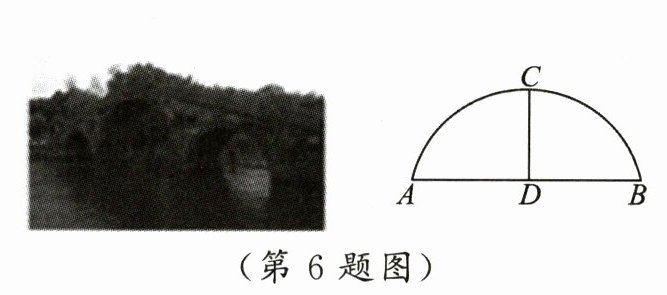 6. 嘉兴南湖不仅是党的诞生地,它优美的风光还吸引全国各地的旅客前来观赏.南湖的一座三孔桥如图所示.某天测得最大桥拱的水面宽$AB$为6m,桥顶$C$到水面$AB$的距离为2m,则这座桥桥拱半径为 (