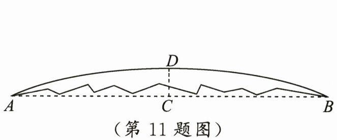 11. 一块圆形玻璃镜面碎成了几块,其中一块如图所示,测得弦$AB$长20厘米,弓形高$CD$为2厘米,则镜面半径为