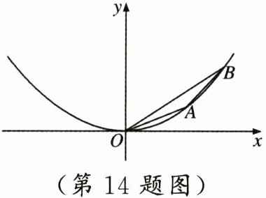 14. 如图, 抛物线 $ y = a x ^ { 2 } $ 经过点 $ A ( 2, 1 ) $ 和 $ B ( 2 n, m ) ( n > 1 ) $, 则 $ \triangle A O B $ 的面积为