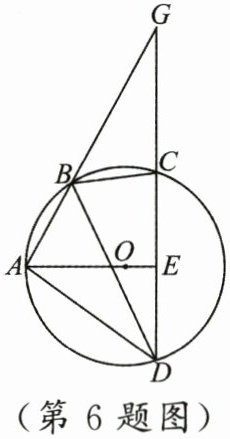 6. 如图,四边形 $ ABCD $ 为 $ \odot O $ 的内接四边形.弦 $ AB $ 与 $ DC $ 的延长线相交于点 $ G $,$ AO \perp CD $,垂足为 $ E $,连结 $ BD $,$ \angle GBC = 48° $,则 $ \angle DBC $ 的度数为 (