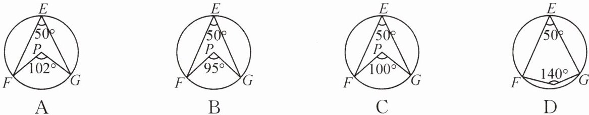 2. 如图,$E$,$F$,$G$为圆上的三点,$\angle FEG = 50^{\circ}$,$P$点可能是圆心的是(
