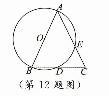 12. 如图,在$\triangle ABC$中,$AB = AC$,$\angle A = 50^{\circ}$,以$AB$为直径的$\odot O$交边$BC$,$AC$于$D$,$E$两点,$AC = 2$,则$\overgroup{DE}$的长是
