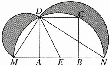 13. 如图,在边长为6的正方形$ABCD$中,$E$是$AB$的中点,以点$E$为圆心、$ED$长为半径作半圆,交$A$,$B$所在的直线于$M$,$N$两点,分别以$MD$,$ND$为直径作半圆,则阴影部分面积为