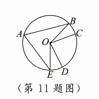 11. 如图,在$\odot O$上顺次取点$A$,$B$,$C$,$D$,$E$,连结$AB$,$AE$,$OB$,$OC$,$OD$,$OE$.若$\angle BAE = 65^{\circ}$,$\angle COD = 70^{\circ}$,则$\overgroup{BC}$与$\overgroup{DE}$的度数之和为
