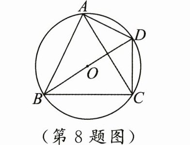 8. 如图,$\odot O$是等边$\triangle ABC$的外接圆,点$D$是弧$AC$上一动点(不与点$A$,$C$重合),下列结论:①$\angle ADB=\angle BDC$;②