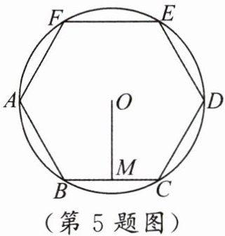 5. 如图,正六边形$ABCDEF$内接于$\odot O$,半径为 6,则这个正六边形的边心距$OM$和$\overset{\frown}{BC}$的长分别为(