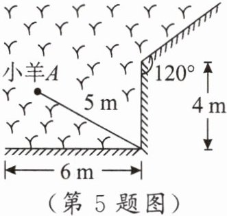 练习 5 如图,一根 $5$ 米长的绳子,一端拴在围墙墙角的柱子上,另一端拴着一只羊 $A$(羊在草地上活动),那么羊在草地上的最大活动区域面积是 (