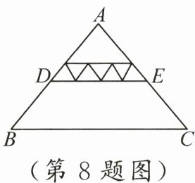 8. 如图,在等腰三角形$ABC$中,$AB = AC$,图中所有三角形均相似,其中最小的三角形面积为$1$,$\triangle ABC$的面积为$44$,则四边形$DBCE$的面积是(