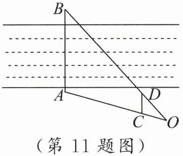 11. 为了测量河宽$AB$,某同学采用以下方法:如图,取一根标尺,把它横放,使$CD// AB$,并使点$B$,$D$,$O$和点$A$,$C$,$O$分别在同一条直线上,量得$CD = 10$米,$OC = 15$米,$OA = 45$米,则河宽$AB =$