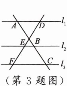 3. 如图,$l_1// l_2// l_3$,两条直线与这三条平行线分别交于点$A$,$B$,$C$和$D$,$E$,$F$。已知$\frac{AB}{BC}=\frac{3}{2}$,则$\frac{DE}{DF}$的值为(