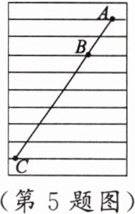 5. 如图,练习本中的横格线都平行,且相邻两条横格线间的距离都相等,同一条直线上的三个点$A$,$B$,$C$都在横格线上。若线段$AB = 4\mathrm{cm}$,则线段$BC =$