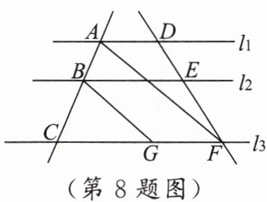 8. 如图,直线$l_1// l_2// l_3$,直线$AC$,$DF$分别交$l_1$,$l_2$,$l_3$于点$A$,$B$,$C$和点$D$,$E$,$F$,连结$AF$,作$BG// AF$。若$\frac{DE}{EF}=\frac{2}{3}$,$BG = 6$,则$AF$的长为(
