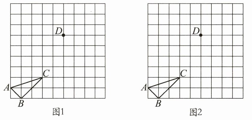15. 我们把顶点都在格点上的三角形叫作格点三角形. 在如下$9×9$的方格中已给出格点三角形$ABC$和格点$D$,请根据下列要求在方格中画图.