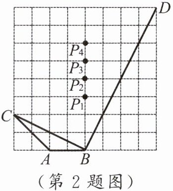 2. 如图,已知$\triangle ABC$和$\triangle PBD$都是正方形网格上的格点三角形(顶点为网格线的交点),要使$\triangle ABC\backsim\triangle PBD$,则点$P$的位置应落在 (