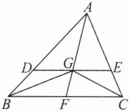 9. 如图,过$\triangle ABC$的重心$G$作$BC$的平行线分别交$AB$,$AC$于点$D$,$E$,求$\frac{S_{\triangle GBC}}{S_{\triangle ADE}}$的值。