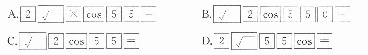 2. 我们数学课本上采用的科学计算器面板如图所示,利用该型号计算器计算 $ \sqrt{2} \cos 55^{\circ} $,按键顺序正确的是 (