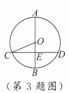 3. 如图,已知 $ AB $ 是 $ \odot O $ 的直径,$ CD $ 是 $ \odot O $ 的弦,$ AB \perp CD $,垂足为 $ E $。若 $ AB = 26 $,$ CD = 24 $,则 $ \angle OCE $ 的余弦值为 (