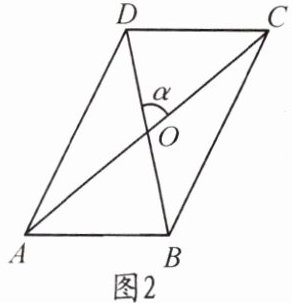应用:如图 2,在 $□ ABCD$ 中,对角线 $AC$,$BD$ 相交成的锐角为 $\alpha$,若 $AC = a$,$BD = b$,试用含 $\alpha$,$b$,$\alpha$ 的式子表示 $□ ABCD$ 的面积.