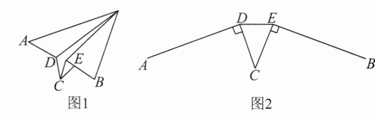 8.小华将一张纸对折后做成的纸飞机如图 1 所示.纸飞机机尾的横截面是一个轴对称图形,其示意图如图 2 所示.已知 $AD = BE = 10 cm$,$CD = CE = 5 cm$,$AD \perp CD$,$BE \perp CE$,$\angle DCE = 40°$.(结果精确到 $0.1 cm$,参考数据:$\sin 20° \approx 0.34$,$\cos 20° \approx 0.94$,$\tan 20° \approx 0.36$,$\sin 40° \approx 0.64$,$\cos 40° \approx 0.77$,$\tan 40° \approx 0.84$)