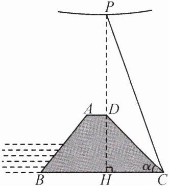 6. 沿江大堤经过改造后的某处横断面为如图所示的梯形 $ABCD$,高 $DH = 12$ 米,斜坡 $CD$ 的坡度 $i = 1:1$。此处大堤的正上方有高压电线穿过,$PD$ 表示高压线上的点与堤面 $AD$ 的最近距离(点 $P$,$D$,$H$ 在同一直线上),在点 $C$ 处测得 $\angle DCP = 26^{\circ}$。