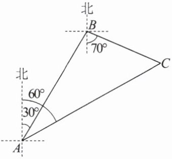 7.如图,一艘货轮在海面上航行,准备要停靠到码头 $C$,货轮航行到 $A$ 处时,测得码头 $C$ 在北偏东 $60^{\circ}$方向上.为了躲避 $A$,$C$ 之间的暗礁,这艘货轮调整航向,沿着北偏东 $30^{\circ}$方向继续航行,当它航行到 $B$ 处后,又沿着南偏东 $70^{\circ}$方向航行 20 海里到达码头 $C$.求货轮从 $A$ 到 $B$ 航行的距离.(结果精确到 0.1 海里,参考数据:$\sin 50^{\circ}\approx0.766$,$\cos 50^{\circ}\approx0.643$,$\tan 50^{\circ}\approx1.192$)