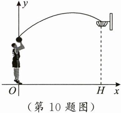 10. 如图,一位篮球运动员投篮,球沿抛物线$ y = - 0.2x^{2} + x + 2.25 $运行,然后准确落入篮筐内.已知篮筐的中心离地面的高度为3.05m,则他距篮筐中心的水平距离OH是