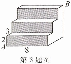 3. 如图是一个三级台阶, 每一级的长、宽、高分别为$8\mathrm{dm}$,$3\mathrm{dm}$,$2\mathrm{dm}$. $A和B$是这个台阶上两个相对的端点, 点$A$处有一只蚂蚁, 想到点$B$处去吃可口的食物, 则蚂蚁沿着台阶面爬行到点$B$的最短路程为(