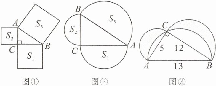(3)如图③,在 Rt△ABC 中,∠ACB = 90°,三边长分别为 5,12,13,分别以它的三边长为直径向上作半圆,求图③中阴影部分的面积。