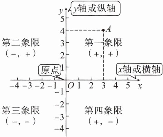 1. 点$\xrightarrow[向y轴作垂线(垂足对应数b)]{向x轴作垂线(垂足对应数a)}一组有序实数对\xrightarrow{}点的坐标(a,b)$,其中$a$表示横坐标,$b$表示纵坐标. 如图,点$A$的坐标为