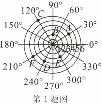 1. 如图,雷达探测器测得六个目标 $ A,B,C,D,E,F $ 出现,按照规定的目标表示方法,目标 $ E,F $ 的位置表示为 $ E(3,300^{\circ}),F(5,210^{\circ}) $. 按照此方法在表示目标 $ A,B,C,D $ 的位置时,其中表示不正确的是 (
