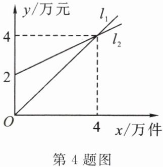 4. 如图,$l_{1}$表示某产品一天的销售收入与销售量的关系;$l_{2}$表示该产品一天的销售成本与销售量的关系,则销售收入$y_{1}$(万元)与销售量$x$(万件)之间的函数关系式为