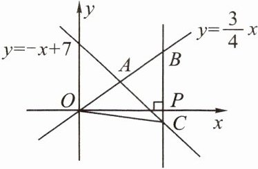 (2)设$x轴上有一点P(a,0)$,过点$P作x$轴的垂线(垂线位于点$A$的右侧),分别交$y = \frac{3}{4}x和y = -x + 7的图象于点B$,$C$,连接$OC$,若$BC = 7$,求$\triangle OBC$的面积。