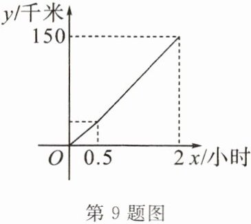 9. (威海市中考)一辆汽车在行驶过程中,其行驶路程$y$(千米)与行驶时间$x$(小时)之间的函数关系如图所示. 当$0\leq x\leq 0.5$时,$y与x之间的函数表达式为y = 60x$;当$0.5\leq x\leq 2$时,$y与x$之间的函数表达式为