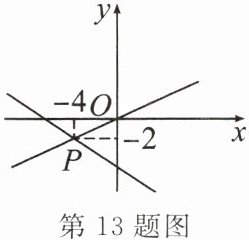 13. (贵阳市期末)如图,已知一次函数 $ y = a x + b $ 和 $ y = k x $ 的图象相交于点 P,则根据图象可得二元一次方程组 $ \left\{ \begin{array} { l } { - a x + y = b, } \\ { k x - y = 0 } \end{array} \right. $ 的解是(
