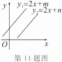 14. 已知一次函数 $ y _ { 1 } = 2 x + m $ 与 $ y _ { 2 } = 2 x + n ( m ≠ n ) $ 的图象如图所示,则关于 x 与 y 的二元一次方程组 $ \left\{ \begin{array} { l } { 2 x - y = - m, } \\ { 2 x - y = - n } \end{array} \right. $ 的解有(