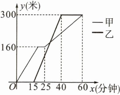 (2)当$25\leqslant x\leqslant 60$时,设甲的函数表达式为$y = mx + n$,将$(25,160)$和$(60,300)$代入得$\begin{cases}160 = 25m + n\\300 = 60m + n\end{cases}$,解得$\begin{cases}m = 4\\n = 60\end{cases}$,$\therefore y = 4x + 60(25\leqslant x\leqslant 60)$.$\because$乙乘坐缆车上升过程中,和甲处于同一高度时距山脚的垂直高度也相同,$\therefore \begin{cases}y = 12x - 180\\y = 4x + 60\end{cases}$,解得$\begin{cases}x = 30\\y = 180\end{cases}$,$\therefore$乙乘坐缆车上升过程中,和甲处于同一高度时距山脚的垂直高度为180米.